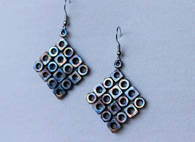 | First up, Dee is sporting your basic steel flat washer, in red...perfect for any gathering or social event for the 7 and under. |